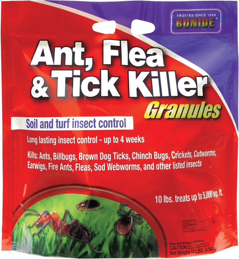 Ant, Flea & Tick Killer Granules is a long lasting and fast acting insect control for homes and lawns. It will last for around 4 weeks. It will treat fleas, ticks, crickets, ants, fire ants, spiders, silverfish, sow bugs, chinch bugs, sod webworm, armyworms, millipedes, leaf hoppers, clover mites, and some grubs.