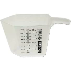 Plastic 4-ounce cup with handle. Calibrated in teaspoons, tablespoons, and ounces for easy use. Capacity: 4 Oz. Standard of Measurement: Standard & Metric Material: Plastic Color: White