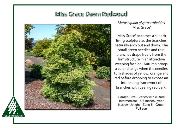 Metasequoia glyptostroboides ‘Miss Grace’ is the first Metasequoia cultivar with strongly weeping branches. This gorgeous plant makes a superb living sculpture when it is staked up so the branches drape freely. The tree’s small needles and thin branches resemble those of the species Taxodium, but with opposite, not alternate, buds and needles. When the deciduous conifer drops its foliage, the peeling bark and swooping framework supply winter interest. Discovered as a witch’s broom in New York, it was introduced by Buchholz & Buchholz Nursery, in Gaston, Oregon.