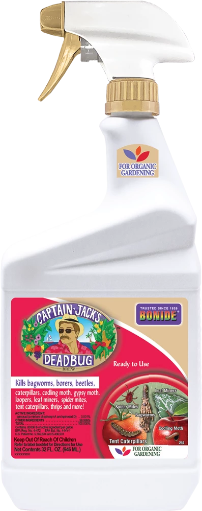 Contains Spinosad “spin-OH-sid”. Deadbug Brew® kills bagworms, borers, beetles, caterpillars, codling moth, gypsy moth, loopers, leaf miners, spider mites, tent caterpillars, thrips and more!
