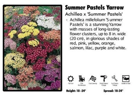 Achillea ‘Summer Pastels‘, ‘Summer Pastels‘ Yarrow. With a soft palette of pastel colored flowers, Achillea millefolium ‘Summer Pastels‘ is a stunning Yarrow with masses of long-lasting flower clusters, up to 8 in. wide (20 cm), in glorious shades of red, pink, yellow, orange, salmon, lilac, purple and white.