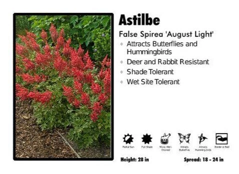 Brilliant and beautiful! Blooming later than most Astilbe, the dense scarlet red plumes of August Light unveil their lush appearance in mid-summer. New foliage, lacy and elegant, emerges in spring tinted red.