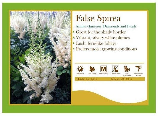 The silvery-white flowers float above a thick mound of lush green foliage. It is a strong grower with a uniform, free-flowering habit. Blooms are densely packed with as many as 1,500 white flowers per spike. Plant in groups for maximum impact adding hard to find color to the shaded garden. To keep Astilbe looking good for the next year, prune in early spring (the old foliage helps protect the plant from winter damage).
