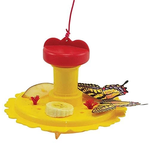 Our garden can be a haven for butterflies with just a little planning. Attract butterflies to your garden or backyard using the Songbird Essentials’ Butterfly Feeder. Designed and tested by a Butterfly Breeder, the patented combination of wicks and tubes that mimic real flower blossoms and small spikes which hold fresh fruit pieces is the number 1 choice of butterfly experts. Fill the feeder with our all natural formula also developed by a butterfly breeder. Feeder design and color attracts butterflies and the nectar reservoir size contains the right amount of nectar to minimize nectar spoilage, which means increased safety for better butterfly health. A list of plants that attract butterflies is included. Easy to assemble, fill and clean. Mount on 3/4 inch post or use the included coated wire to hang. 6 inch diameter.