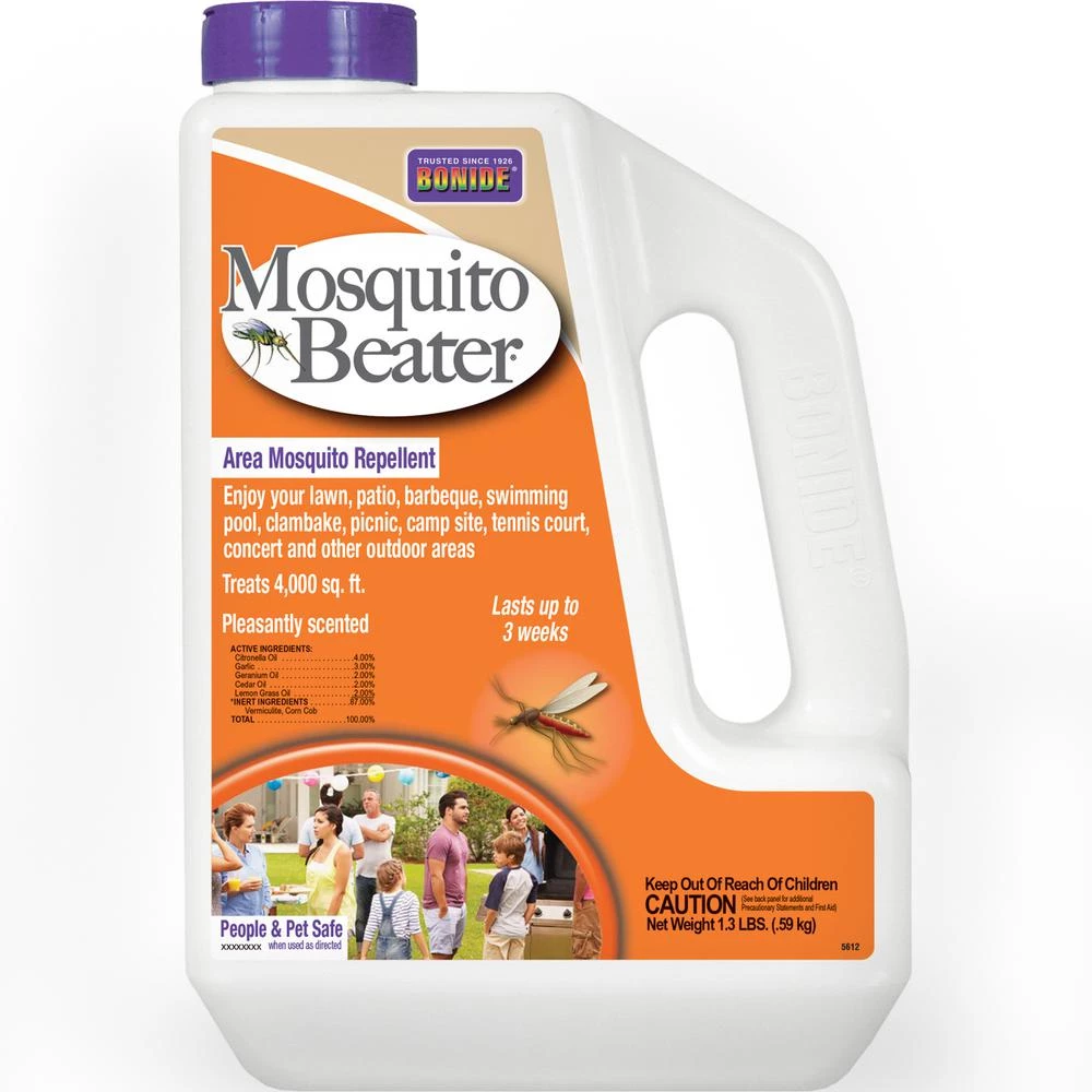 BONIDE Mosquito Beater® Granules repel mosquitoes from large outdoor areas for weeks. Made with natural ingredients. People & pet safe, when used as directed. Mosquito Beater is the hit of the party.
