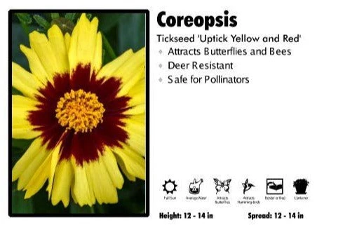 Uptick Yellow and Red Tickseed is a sunny summer border plant or container filler. And it is delightfully bright when planted as a mass of flowers like a meadow. Coreopsis is a North American native, so the plant tends to be low maintenance and a host for bees and butterflies.