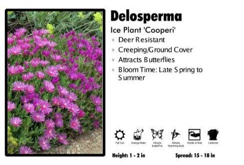 Delosperma Cooperi is covered with large magenta-pink flowers for much of the summer. A perfect groundcover where easy-care, high color is on the wish-list. It grows vigorously, creating a succulent carpet of color.