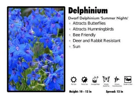 Delphinium are a classic garden perennial. These plants are excellent for adding height to small spaces. Their tall flower spikes are easily recognizable when they come into flower in summer. When in flower, the spikes of these plants become heavy and should be staked to avoid toppling over in rough weather, especially taller varieties. Newer hybrids are longer lived than some of the more traditional cultivars.