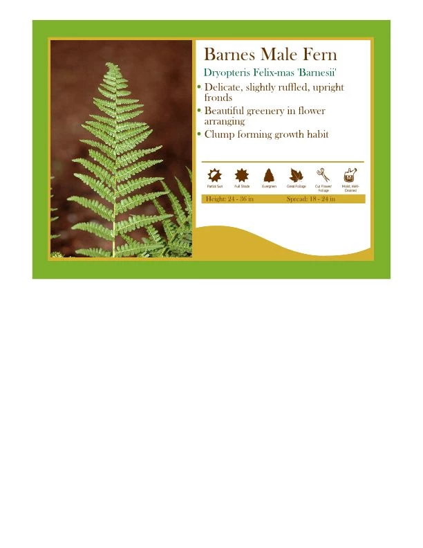 Dryopteris are woodland ferns from temperate regions of the Northern Hemisphere. Usually found by streams and lakes. In spring, the crowns of crosiers unfurl to display lance shaped fronds in various shades of green. Most ferns thrive in moist, humous rich free draining soil in full or partial shade. Some will tolerate full sun for part of the day. Some species are drought tolerant and will thrive in walls and rock crevices. ‘Barnesii’ forms a clump of delicate, upright fronds which have a slightly ruffled appearance.Foliage remains attractive all summer long, and is suitable for flower arranging. Prefers clay soil.