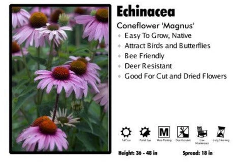 Praised for their large, daisy-like flowers which appear from midsummer thru fall, after many other perennials have finished blooming, Coneflowers are a mainstay in today’s garden. If deadheaded, the bloom cycle will be extended. However, some spent blooms should be left on the plants in fall because their seeds provide winter food for finches and other birds. The dried seed heads also provide architectural interest in the winter.