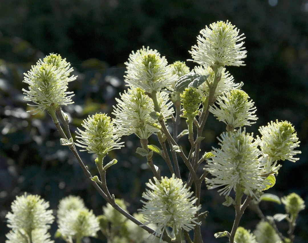 A deciduous shrub with deep blue-green leaves that have spectacular range of fall color. Showy, honey-scented, bottlebrush-like, white flowers appear before foliage emerges in spring. A beautiful addition to the landscape in semi-shaded mixed shrub borders, or as a background shrub, or hedge plant.
