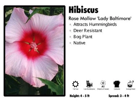 Valued for its late summer display, ‘Lady Baltimore’ produces 5-6 inch wide, pink blooms with satiny, red centers and ruffled petals.