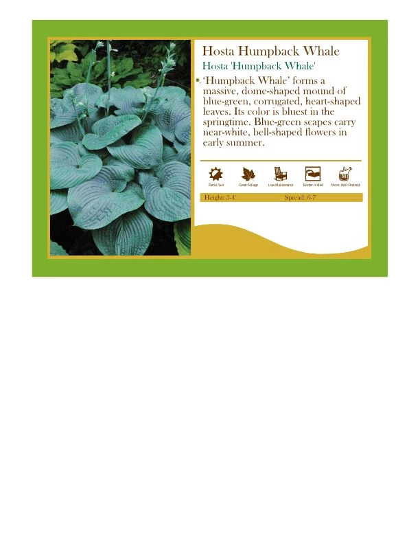 ‘Humpback Whale’ forms a massive, dome-shaped mound of blue-green, corrugated, heart-shaped leaves. Its color is bluest in the springtime. Blue-green scapes carry near-white, bell-shaped flowers in early summer.