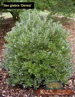 Leathery foliage and glossy green leaves on a compact, informal shrub! Inkberry Holly (Ilex glabra ‘Densa’)! Mid-sized evergreen has lighter green foliage that looks handsome and invigorating year-round.