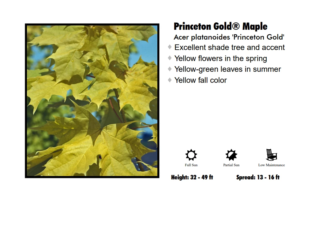 This variation of Norway Maple is a real show stopper. The eye-popping bright yellow-gold leaves emerge in early spring and add good color in the landscape into mid-summer and again in fall. Princeton Gold Maple produces a nice oval crown within a few years, and is adaptable to many soil types. It prefers well drained soils, so you should avoid water logged soils. Attaining a mature size of 35′-45′ tall, this makes the Princeton Gold Maple a good mid-sized tree.