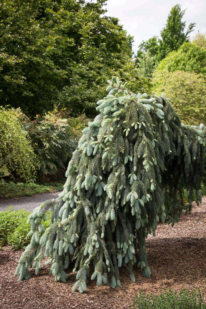 With no two plants alike, the strongly weeping branches and irregularly spreading and drooping top create a unique, bright silver-blue specimen. A striking focal point when combined with complementing deep yellows, pinks and greens. Evergreen.