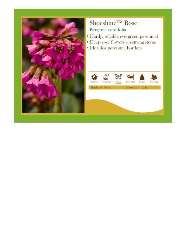 Bergenia are incredibly hardy, and reliably evergreen throughout nearly the entire continent. Plants form a low clump of bold, leathery green leaves, which often turn bronze during winter. This is a new variety of Bergenia from the Shoeshine™ series featuring strong stems of deep rose blooms rising above the glossy, dark green foliage in mid spring. The winter leaves are a valuable addition to cut flower bouquets. Most effective when mass planted or used as an edging along a walkway. Tolerates a wide range of soil conditions, in both sun or part shade. Easily divided in spring or early fall.