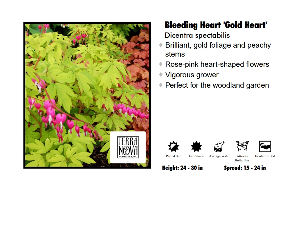Arching sprays of everyone’s favorite classic bleeding heart flower, pink and white heart-shaped blooms, dangle from the stems in late spring. The foliage typically mellows a bit in color as the season progresses.