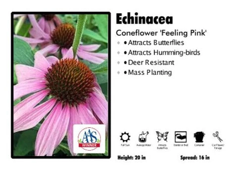 Echinacea Feeling Pink is compact and floriferous with numerous rosy pink flowers. It is bred to be tough and able to withstand heat and drought while filling up those empty spots. Shorter than many varieties, at 20″, they fit in well in the border.
