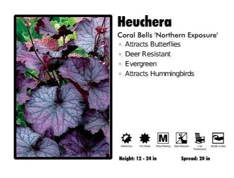 Heuchera Northern Exposure Purple with its hardy richardsonii breeding is quite cold hardy and the foliage remains fresh and appealing late into the season. A great way to add large blocks of color in the shade is to combine several Coral Bells with their ever-expanding striking hues.