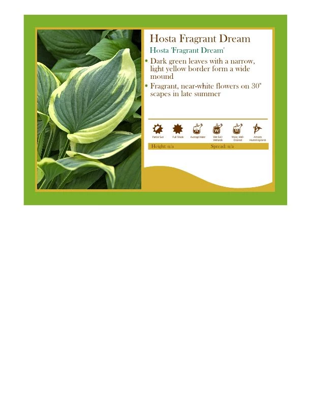Fragrant Dream Hosta features dainty spikes of fragrant white tubular flowers rising above the foliage in mid summer. Its attractive textured heart-shaped leaves emerge buttery yellow in spring, turning forest green in color with distinctive creamy white edges and tinges of grayish green throughout the season. The fruit is not ornamentally significant.