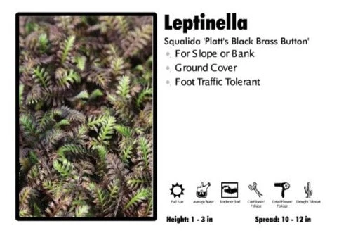 Tiny fern-like foliage is smoky bronze purple with hints of green. An attractive ever-spreading soft mat will tolerate light foot traffic. Perfect for around stepping stones and as a groundcover. Quickly spreads by runners. Dark green flowers in early summer are the ‘buttons’.