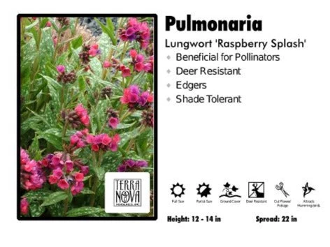 Brightest raspberry and deep purple blossoms on upright heavily spotted lance-like leaves. Chosen for its intense color, upright habit and profuse flowering. An outstanding addition to Lungwort – excellent plants for shade gardens.
