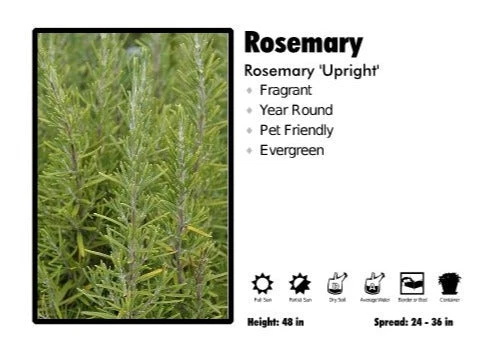 One of the finest herbs, this is actually a pretty shrub as well, with narrow grayish needle-like foliage and pretty lavender-blue flowers in spring on an upright form; leaves are a mainstay for cooking and as garnish, wonderful to grow in a container.