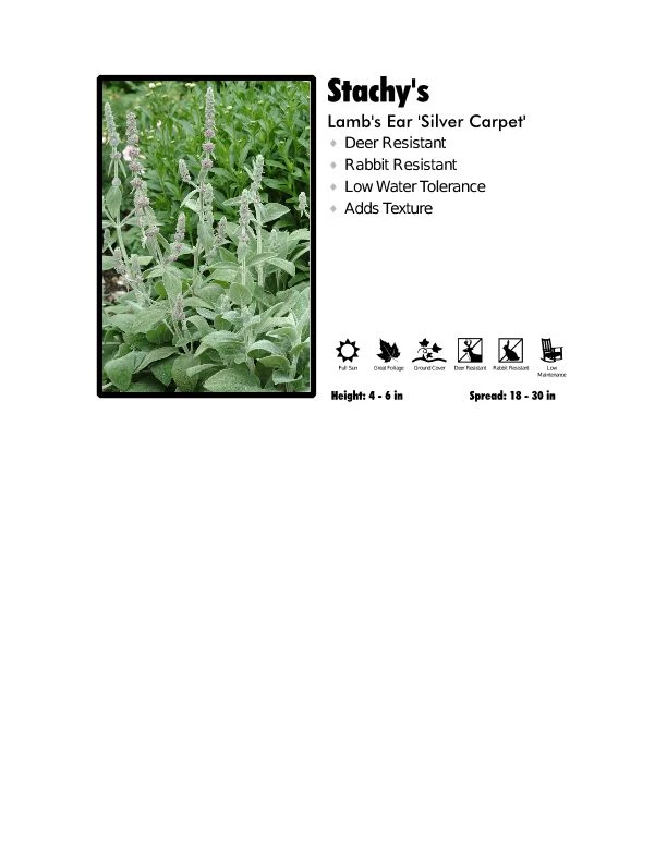 Silver Carpet Lamb’s Ear (Stachys byzantina Silver Carpet) is a handsome, fuzzy, grey-leaved groundcover that thrives in problem areas such as dry shade and poor soils. Silver Carpet Lamb’s Ear is a drought resistant (xeric), non-flowering perennial plant.