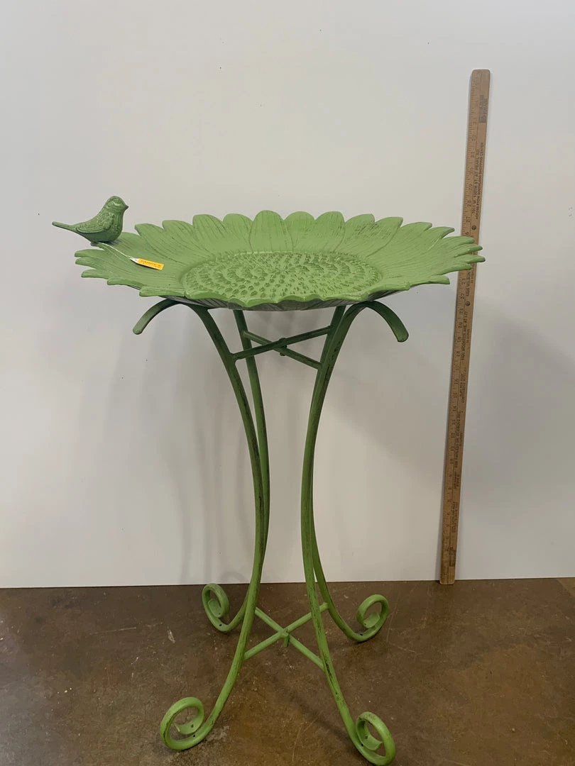 Sunflower design top, bird perched on side, metal, worn look, 29in high, 19in diameter