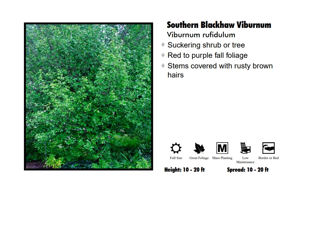 Viburnum prunifolium, commonly called black haw, is usually grown as a large, upright, multi-stemmed, deciduous shrub with an irregular crown, but it also may be grown as a small, single trunk tree. As a shrub, it typically grows 12-15′ tall with a spread of 6-12′, but as a tree may reach a height of 30′. A Missouri native plant which commonly occurs in moist woods, thickets and on streambanks throughout the State. Non-fragrant white flowers in flat-topped cymes (to 4.5″ diameter) appear in spring. Flowers give way in autumn to blue-black, berry-like drupes which often persist into winter and are quite attractive to birds and wildlife. Ovate, finely toothed, glossy dark green leaves (to 4″ long) turn attractive shades of red and purple in fall. Fruits are edible and may be eaten off the bush when ripe or used in jams and preserves.