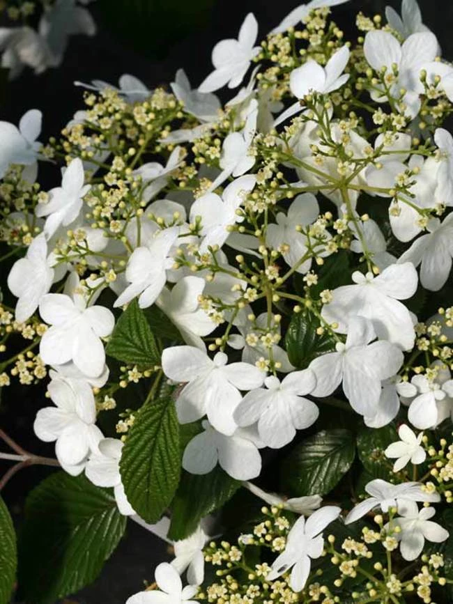 Its low-growing horizontal habit makes an ideal edger or a lovely accent cascading over a rock wall. Abundant large lacecap flowers in white smother the attractive veined foliage in spring. We like saying the name too!
