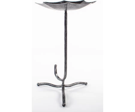 Metal bird bath shaped as a whimsical inside out umbrella.