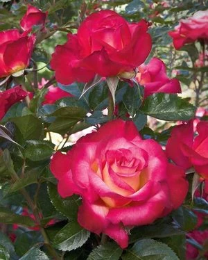 The blooms are gorgeous, cream colored in the center and cherry around the petals edges. That coloring makes it look as if the blooms were lit from within. They’re also lightly fragrant, with a scent like cinnamon. This rose is resistant to black spot and mildew and has long stems that make Dick Clark a wonderful addition to floral arrangements.
